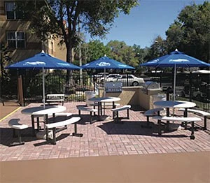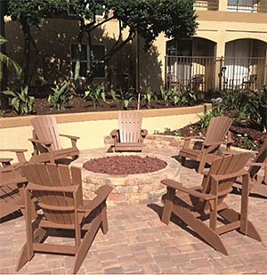 Enhancing the property with seating areas, walking paths, gaming areas, and fire pits takes up space with permanent structures instead of plants. Popular social gathering spots at Blue Tree Resort include a new fire pit, a large chess & check- ers set, shuffleboard, seating areas, and seated retaining walls. Guests love these spots and the areas do not require consistent maintenance like pulling weeds or mowing, which saves money annually.