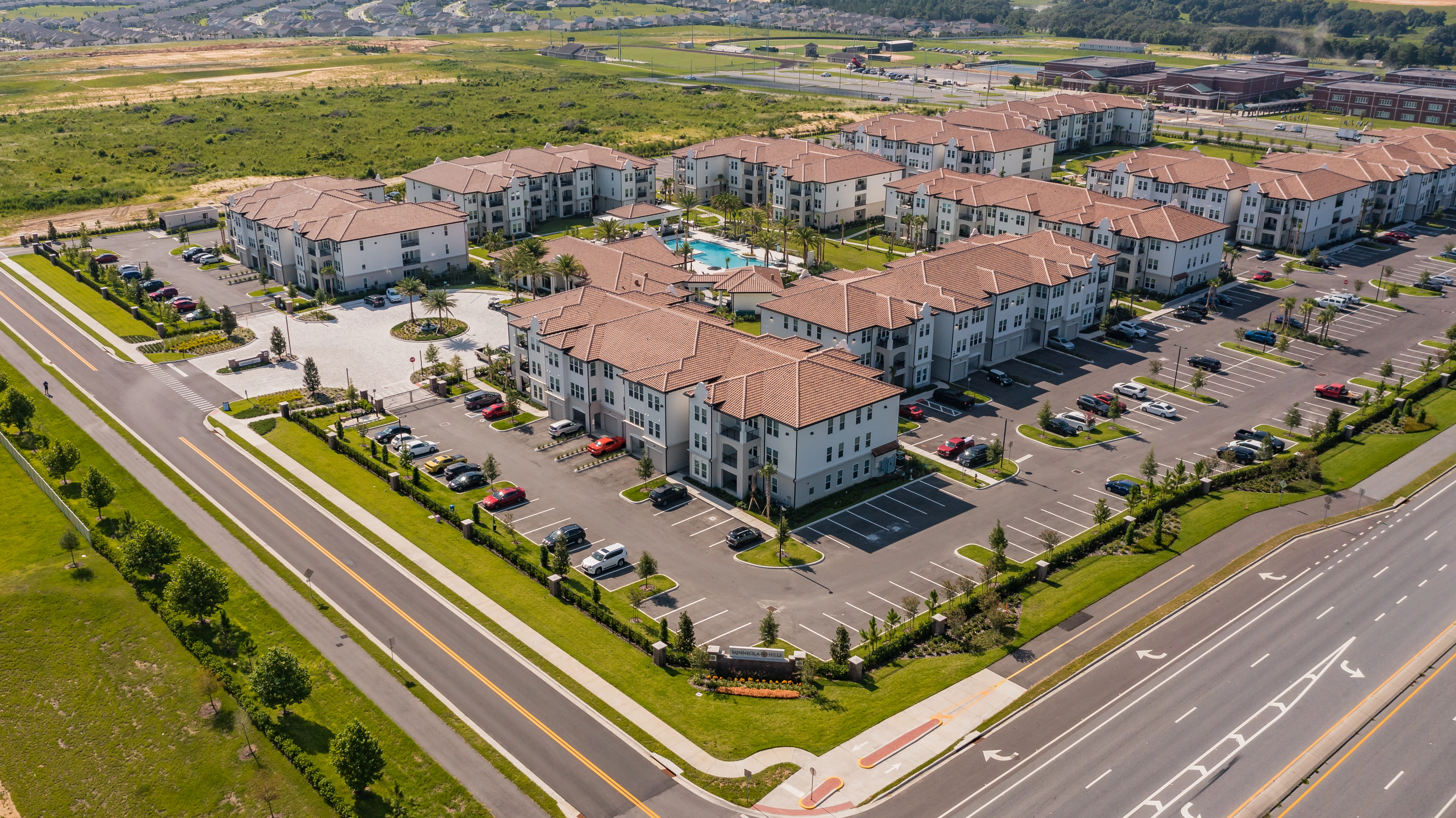 We recently completed a large commerical landscape and irrigation project called Minneola Hills. Minneola Hills - the first and only multifamily community in Minneola (Lake County, Florida). Located at 100 Hillside Park Street in Minneola, Florida, the 297-unit Minneola Hills is part of the extensive Hills of Minneola planned unit development project, which includes single-family homes, a town center, and Publix Super Market.